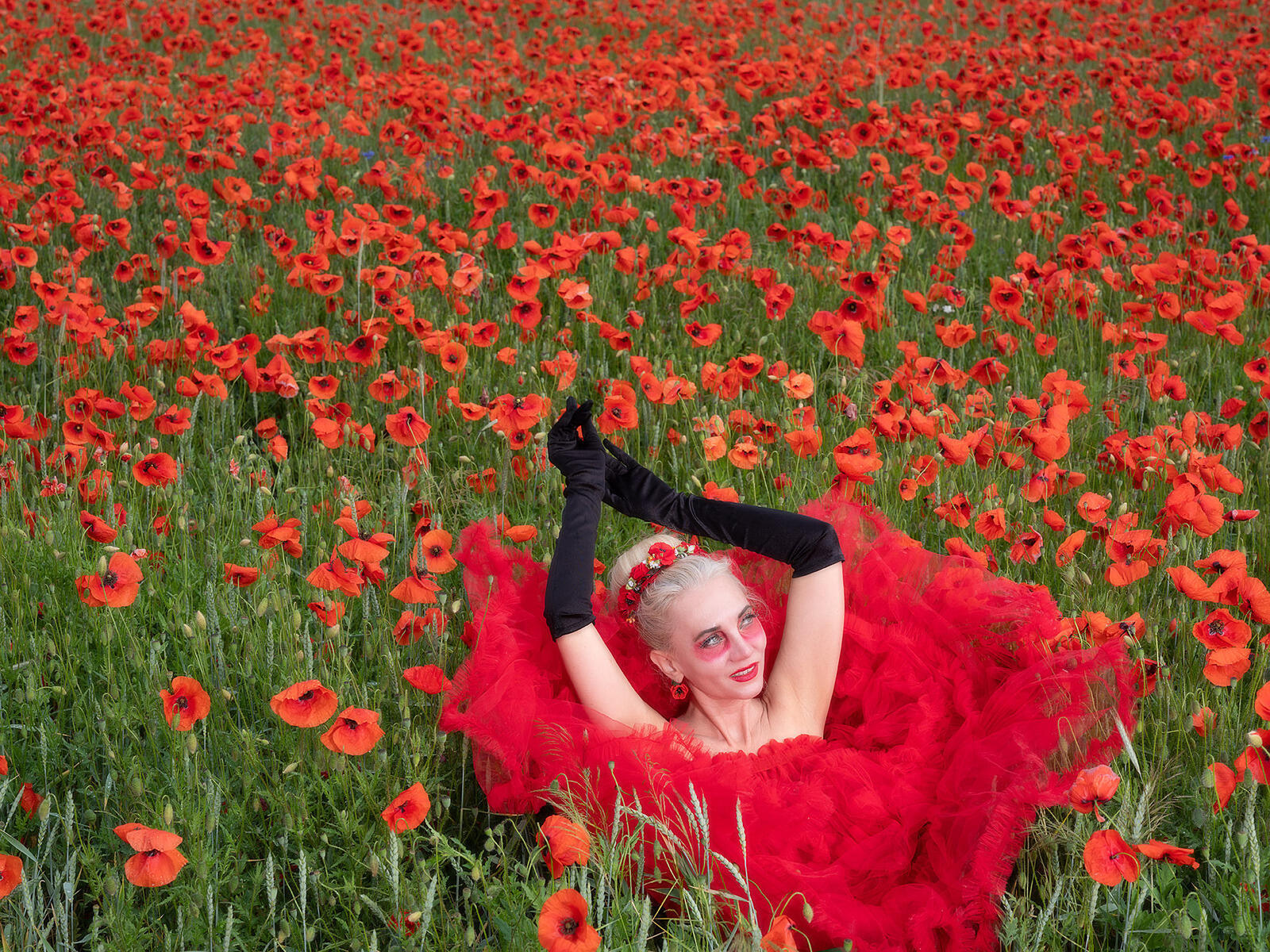 Poppy Luxury - Das Kunstwerk zeigt eine Frau in einem leuchtend roten Kleid, die inmitten eines weiten Feldes aus roten Mohnblumen versinkt. Die Farbe des Kleides und der Blumen verschmelzen fast miteinander, doch die Frau sticht klar hervor. Der Künstler hat die Frau so dargestellt, dass sie die schönste Mohnblume im Feld ist, ihre Anmut und Eleganz überstrahlen die natürliche Schönheit der Blumen. Mit der Darstellung will der Künstler die Aussage unterstreichen, das nur Frauen schöner als Blumen sind. Die Szene soll den Luxus der Natur mit der menschlichen Schönheit harmonisch darstellen. Menschliche Schönheit existiert nur in perfekter Harmonie mit der Natur.